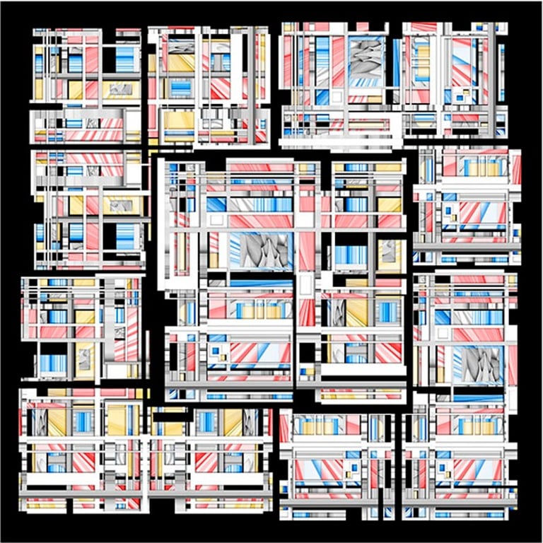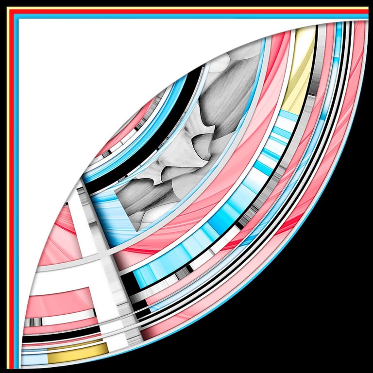 This striking abstract artwork presents a dynamic swirl of colors, seamlessly blending vibrant hues of red, blue, yellow, and white against a bold black backdrop. A homage to Mondrian, it reflects his use of primary colors and bold lines, while the intricate design draws the eye inward, creating a sense of movement and depth that invites contemplation. Each curve and line reveals a modern aesthetic, making it a captivating focal point for any space. This piece not only enhances your decor but also sparks conversation, making it a perfect addition to your collection.
